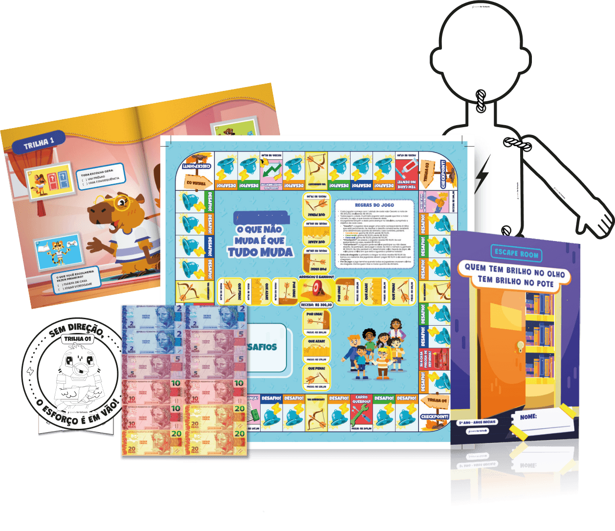 Os estudantes recebem acessórios pedagógicos que são materiais físicos que os aproximam dos conceitos de educação financeira, empreendedora e socioemocional de forma lúdica e interativa.